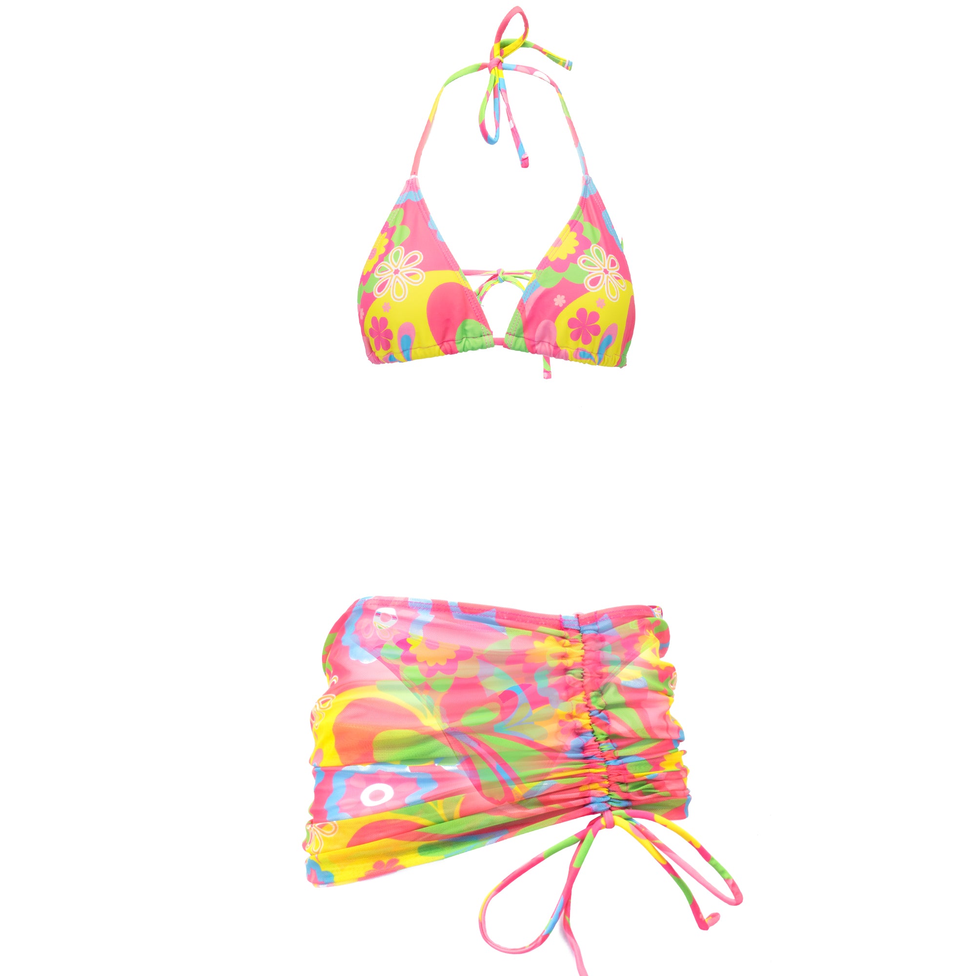 This triangle bikini top is a halter neck style with elasticated straps and removable padding. This bikini top can be worn multiple ways. Matching bikini bottoms are a cheeky cut, high hip design and are lined with a silver plate on back center. Includes matching mesh beach skirt cover up. This 3-piece set is the perfect beach day look.